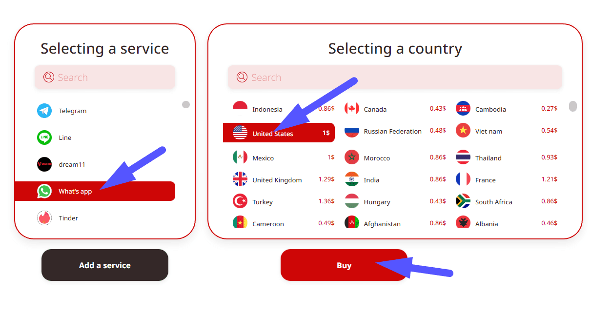 Proceed to purchase. In the left field, specify the service (WhatsApp), in the right - the country. Prices for each state are indicated for the convenience of users. It is recommended to use the search bar to save time. When all items are selected, the purchase button is activated.