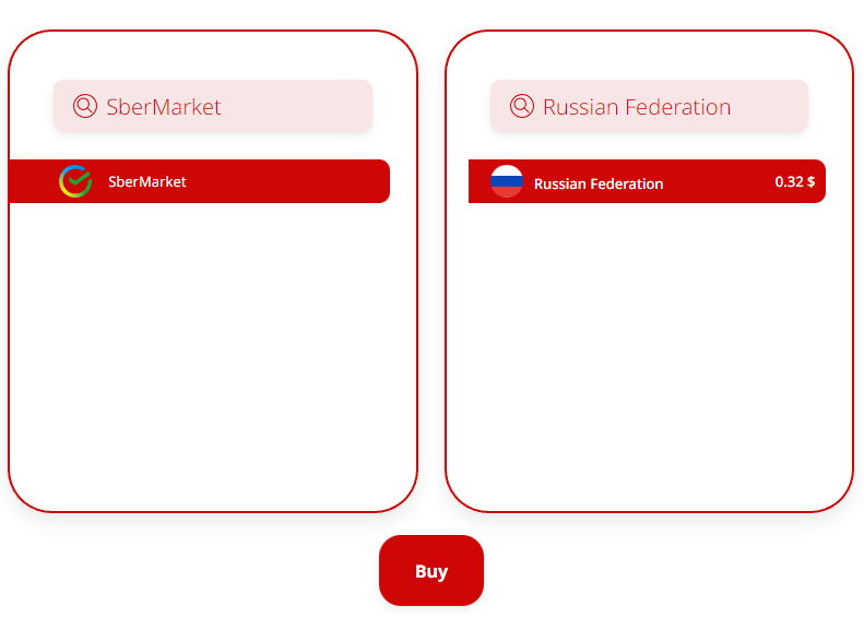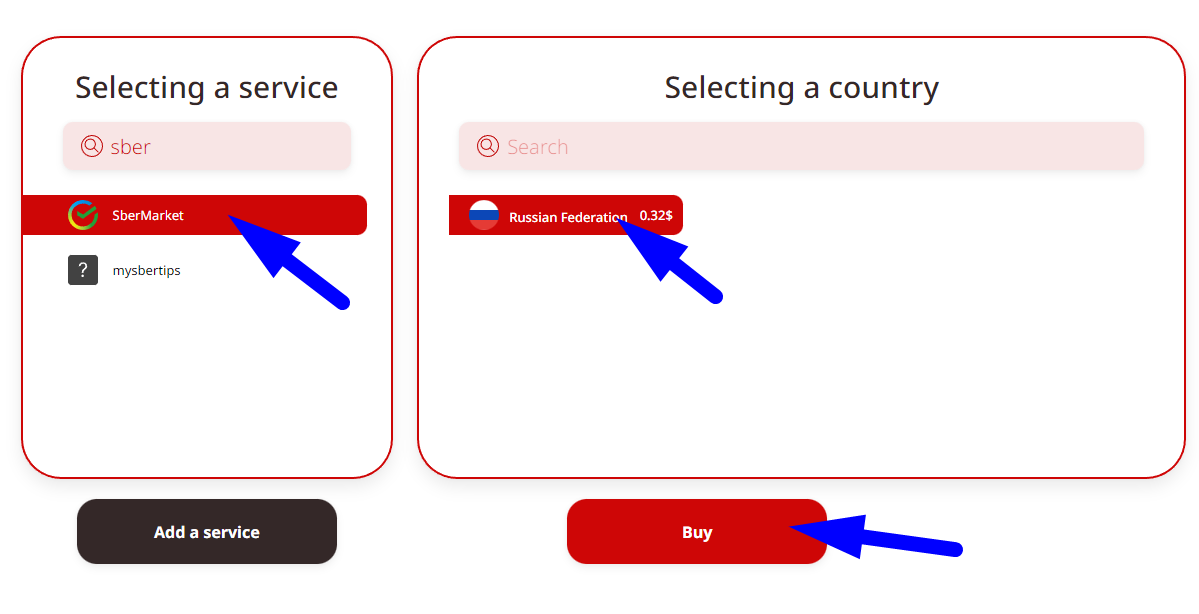 Now we can buy a phone number for SberMegaMarket. First we indicate the service, then we choose the country. It is by no means necessary to find the item in a list of hundreds of positions. It is enough to partially or fully enter the name in the search line for the system to display matches.