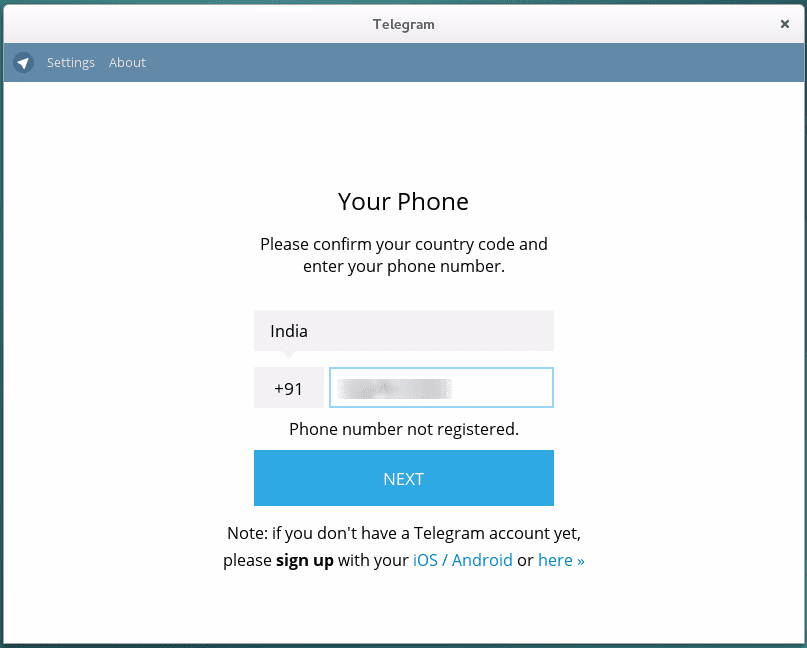 A field for entering a mobile number appears in front of us. We indicate the free number for receiving SMS from Telegram, which we received in the previous step. Don't forget to set the country correctly, otherwise the code cannot be received.