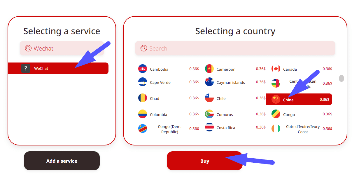 Purchase a number for WeChat. To do this, you need to specify the service and the country, then click the appropriate button.