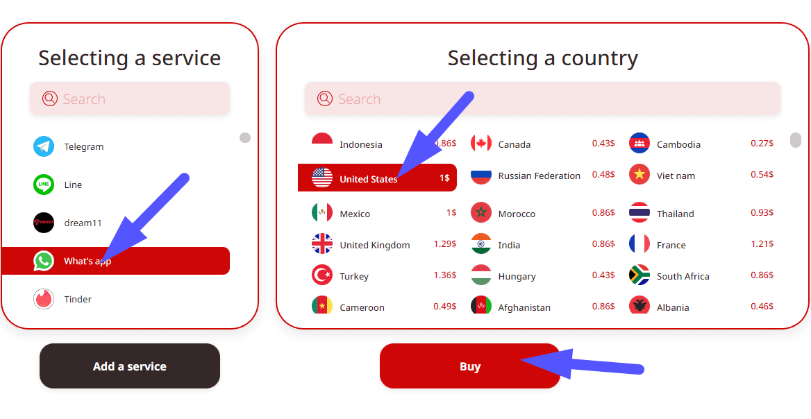 Buy a virtual number - specify the service for registration (WhatsApp) and the country.