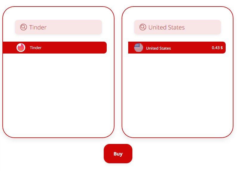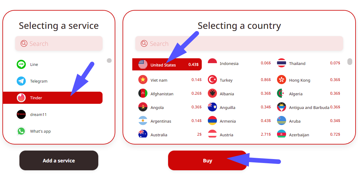 Buy a virtual number. In the first field, select the service (Tinder), in the second - the country. Searching among hundreds of options can be a difficult task. The service suggests using the search field, where you enter the name you are interested in or its part. The system will immediately give matches.