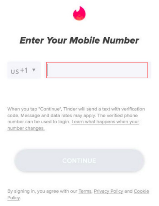 Open the Tinder registration window. Proceed until the system asks you to enter your mobile phone number. Enter the virtual number purchased earlier (don't forget to correctly set the country code). A notification will appear that an SMS with a verification code has been sent.