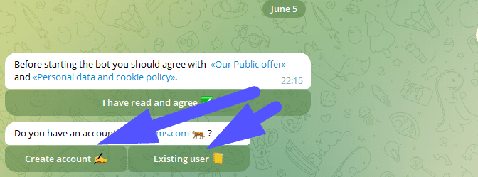 To receive SMS in Telegram, you must have your own Tiger SMS account. Two options are offered - create a new by clicking Create account or continue with an existing (click Existing user).