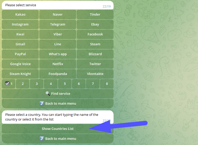 Once the balance is replenished, it becomes possible to fully use the functionality of the sms telegram bot. Select the Show Services List option.