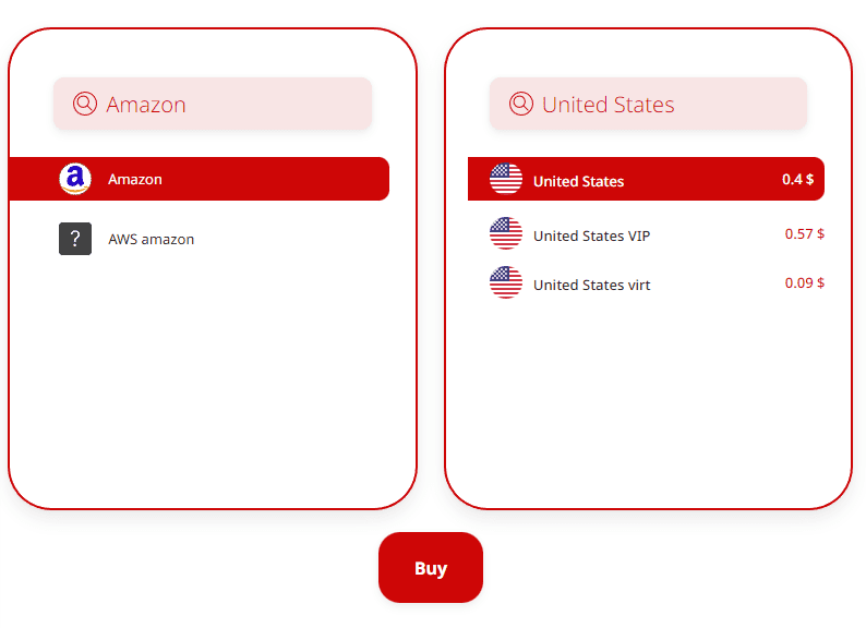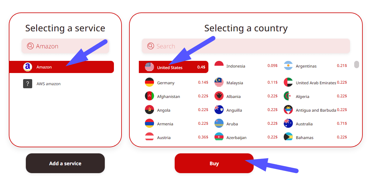 To use a phone number for registration, you need to buy it. As an example, let's purchase a phone for Amazon. This is a whole ecosystem that offers favorable conditions for first-time orders. First, choose the service, then the country. When the necessary data is entered, you can click "buy."