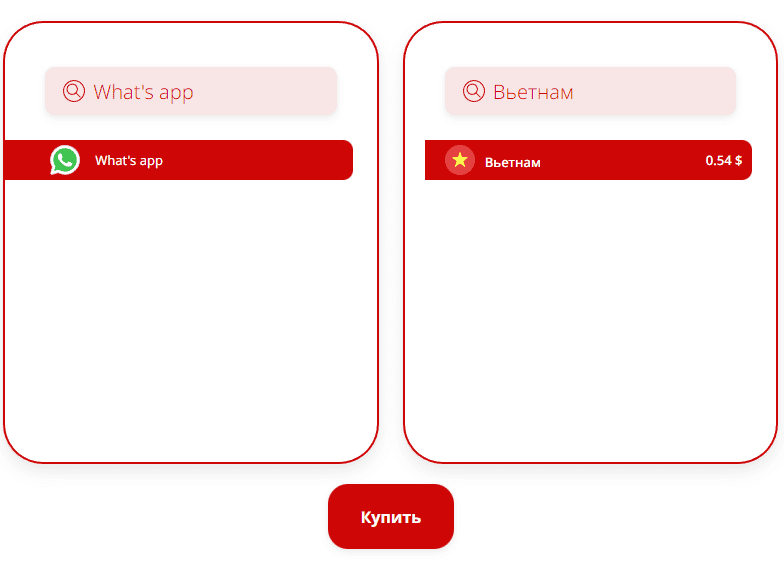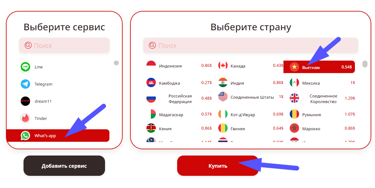 Приступаем к покупке. В левом поле указываем сервис (WhatsApp), в правом страну. Для удобства пользователей указаны цены для каждого государства. Рекомендуется воспользоваться строкой поиска для экономии времени. Когда все пункты выбраны, активируется кнопка покупки.