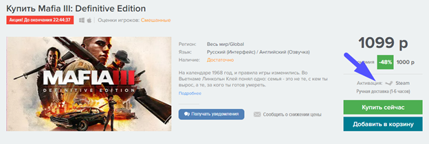 При покупке нужно обратить внимание, чтобы активация происходила именно на платформе Steam.