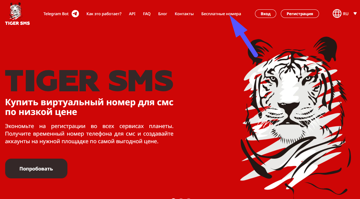 Заходим на сайт «Tiger SMS». Регистрация не является обязательной, что является важным преимуществом. В верхнем меню выбираем пункт «Бесплатные номера».