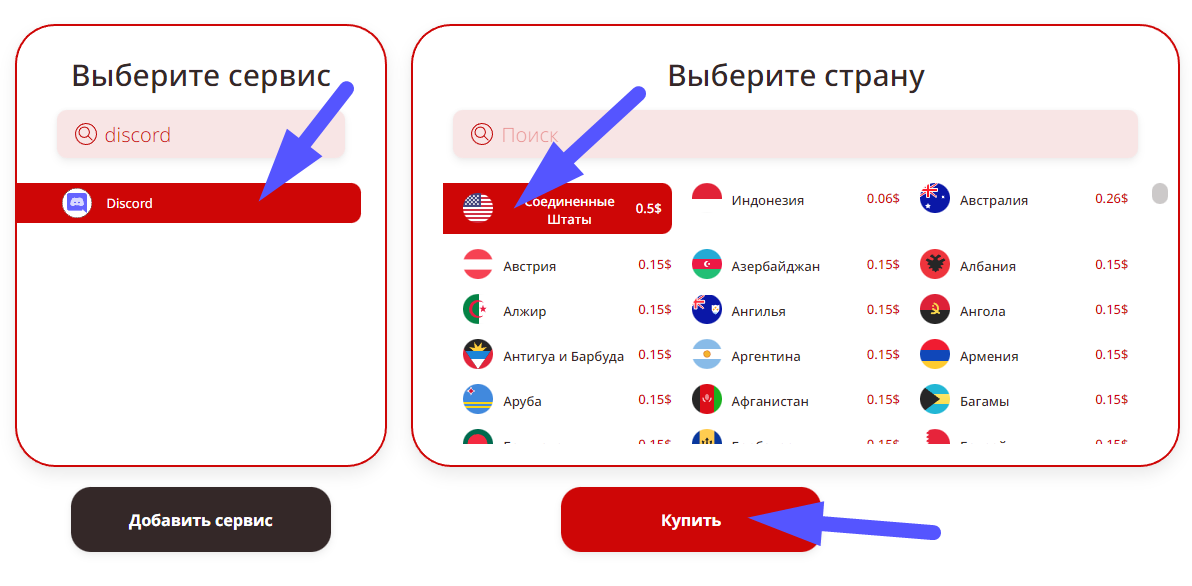 Приступаем к покупке. Необходимо указать сервис (Discord), потом страну виртуального номера. Нажимаем появившуюся кнопку «Купить». Для ускорения поиска имеется соответствующее поле, куда требуется ввести название интересующего сервиса/страны.