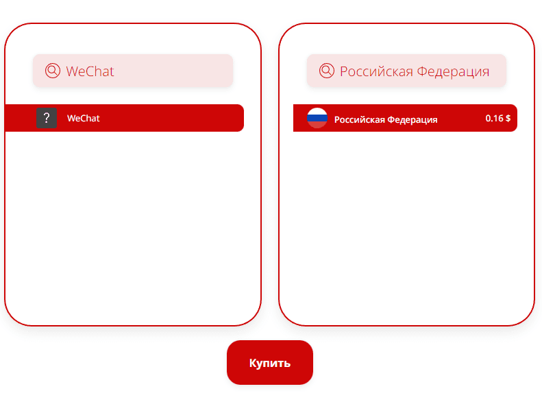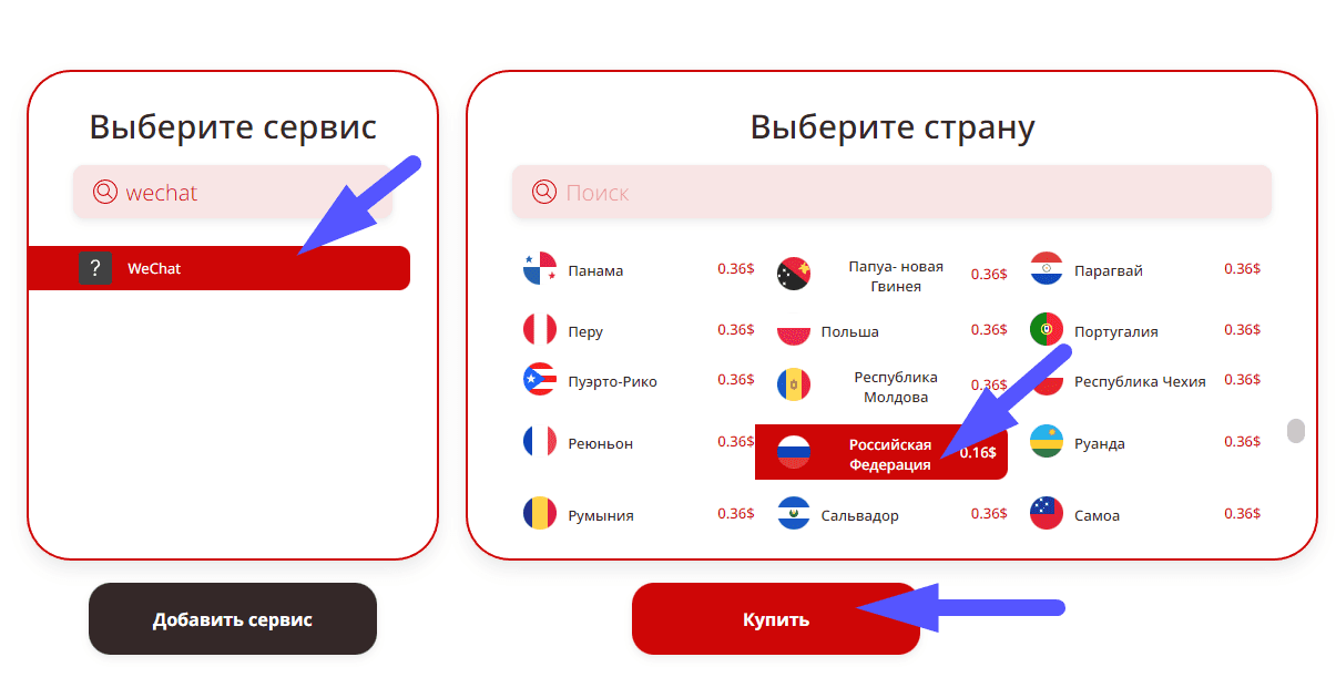 Покупаем номер для Вичат. Для этого, необходимо указать сервис и страну, после чего нажимается соответствующая кнопка.