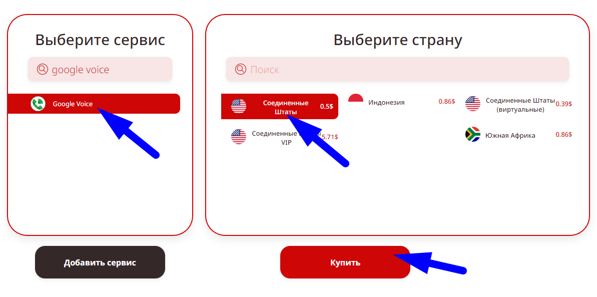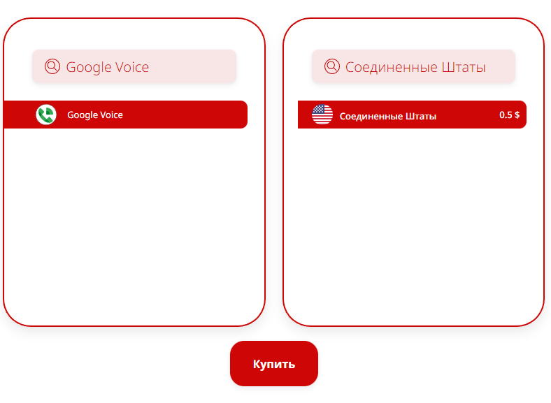 Теперь нужно купить виртуальный номер Google Voice. Выбираем данный сервис в первой колонке и интересующую страну во второй (не Российскую Федерацию). Нажимаем на кнопку «Купить».