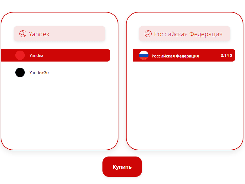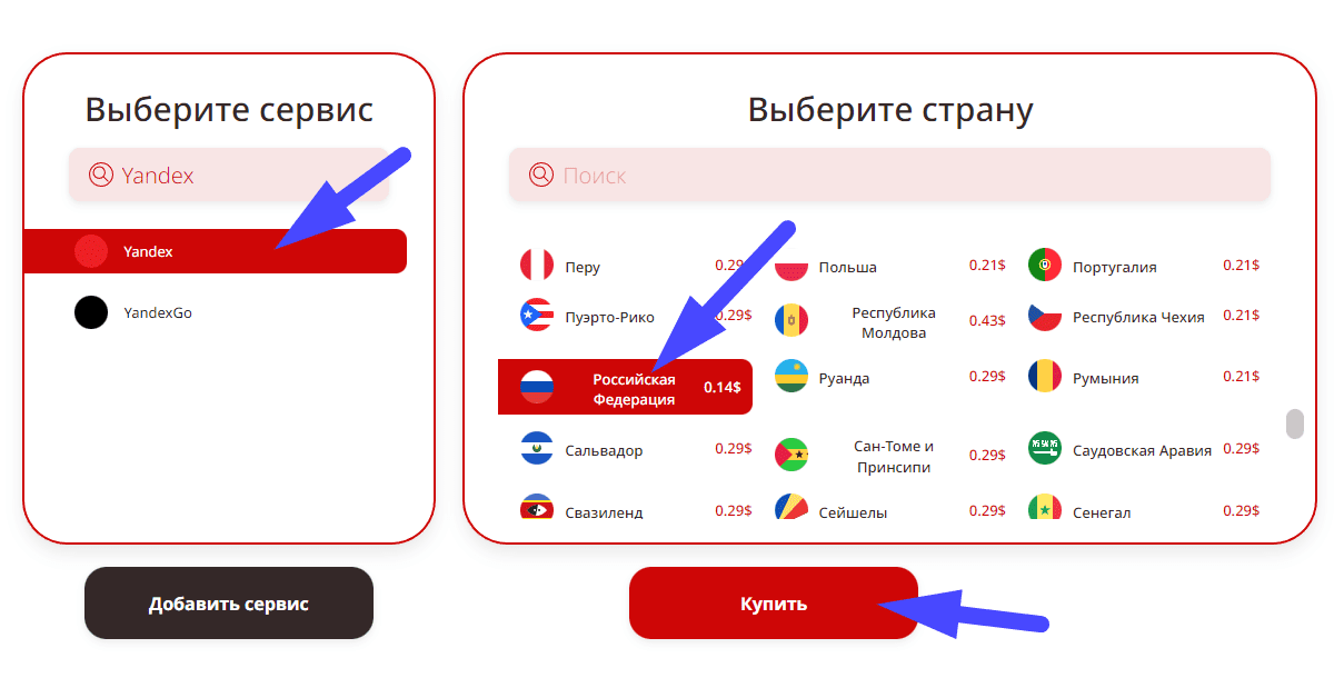 Пришло время купить виртуальный номер телефона для Яндекс. В левом окне указываем сервис, в правом страну. Чтобы не искать долгое время нужный вариант в списке, воспользуйтесь поисковой строкой. Название можно ввести частично или полностью.