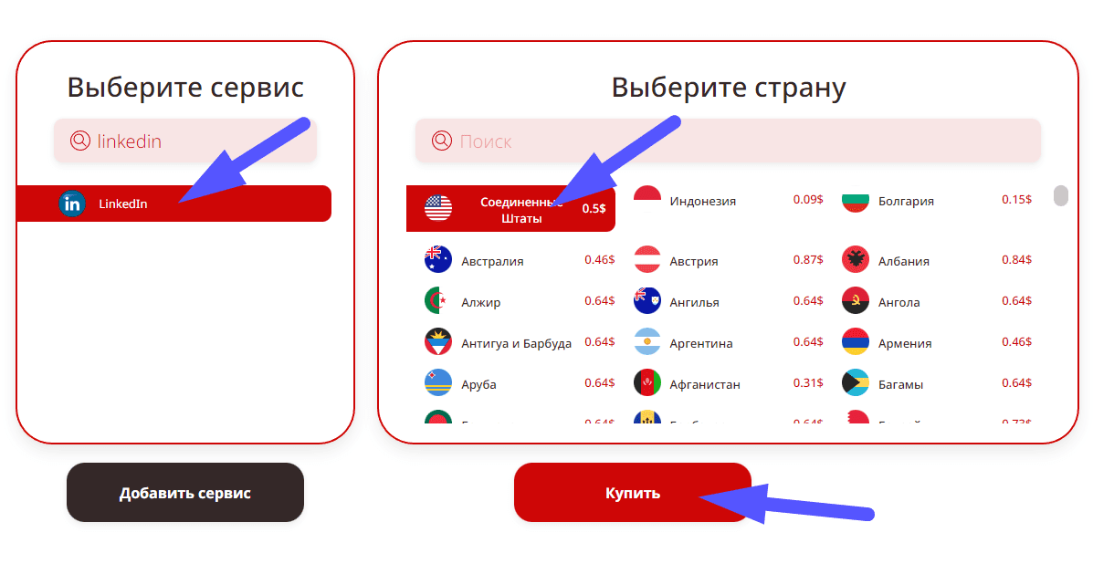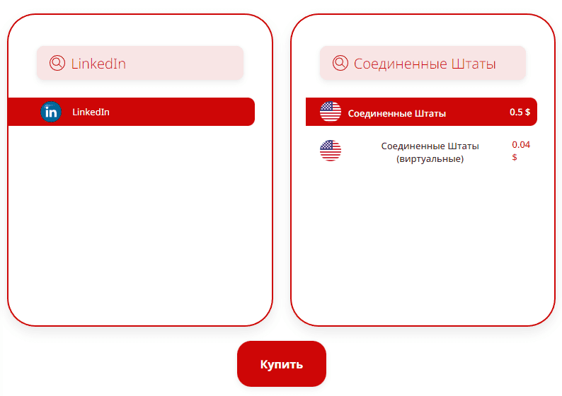 Теперь можно купить номер *Linkedin. Магазин содержит две области, слева указываем сервис, справа страну. Поскольку список содержит сотни вариантов, рекомендуется ввести название или его часть в графу поиска. Система выдаст совпадения, что гораздо удобнее. Нажимаем кнопку «купить».