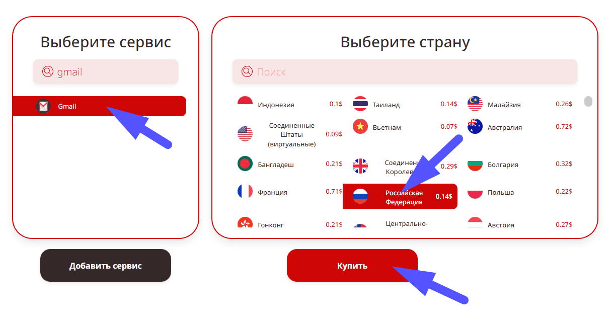 Нам требуется купить номер для подтверждения Gmail. Переходим к магазину, где в левой колонке выбираем сервис. Становится доступным список в правой части, где представлены страны и стоимость. Указываем подходящий вариант, после чего переходим к оплате. Не обязательно искать нужную страну или сервис в длинном перечне. Имеется специальное поле, куда достаточно ввести название или его часть.