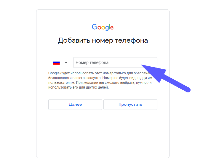 Нам последовательно выводят окна, в которых требуется указать информацию. Это адрес электронной почты, дата рождения владельца, имя/фамилия и прочее. Последним выдается окно для ввода телефона. Используем купленный ранее виртуальный номер и нажимаем «Далее».