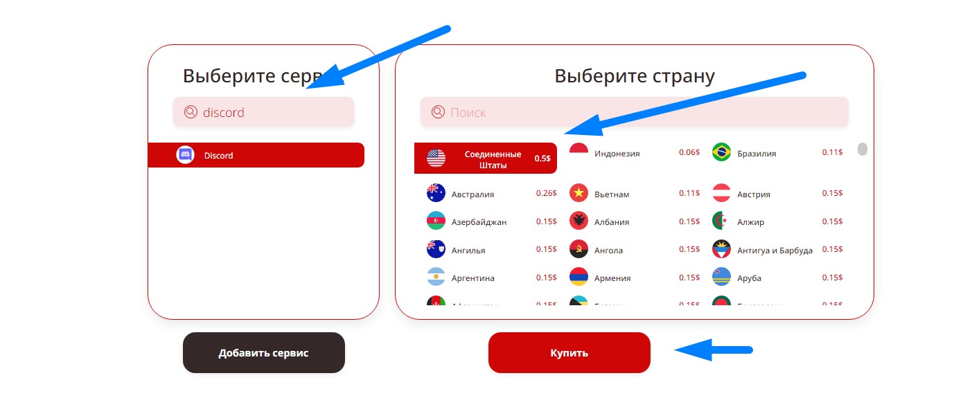 3. Оплатите покупку номера. Для этого сначала выбираем страну страна и площадку (Discord).