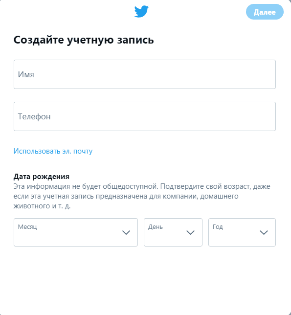 Теперь переходим на страницу регистрации *Twitter, выбираем вариант с указанием номера. Вводим телефон, который приобретен ранее, нажимаем «Далее» и происходит отправка СМС.