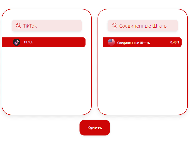 Теперь, можно непосредственно купить номер телефона для Тик Тока. В магазине имеется две области. В первой мы указываем сервис (TikTok). Во второй появляется список доступных стран. Рядом прописывается стоимость, что удобно для пользователя. Когда оба варианта указаны, активируется кнопка «Купить».