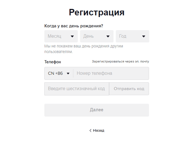 Переходим к странице регистрации в TikTok. Чтобы не попасть под ограничения российских пользователей, рекомендуется сменить геолокацию. Оптимально, если страна IP адреса будет совпадать с государством купленного номера. Выбираем вариант «Ввести телефон или электронную почту».