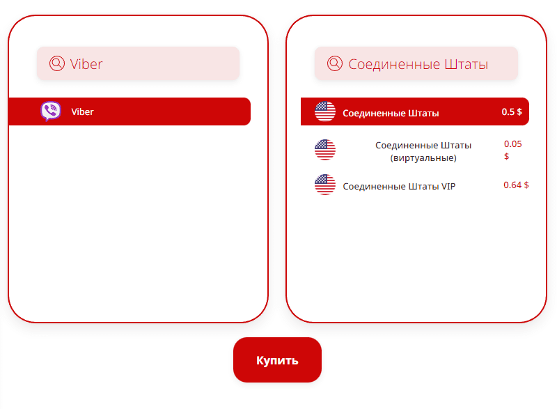 Переходим к покупке. В правом списке выбираем подходящий сервис (Viber). В левом указываем интересующую страну, после чего становится активной кнопка «Купить». Не обязательно пролистывать список до подходящего варианта, поскольку в верхней части имеется поле поиска.
