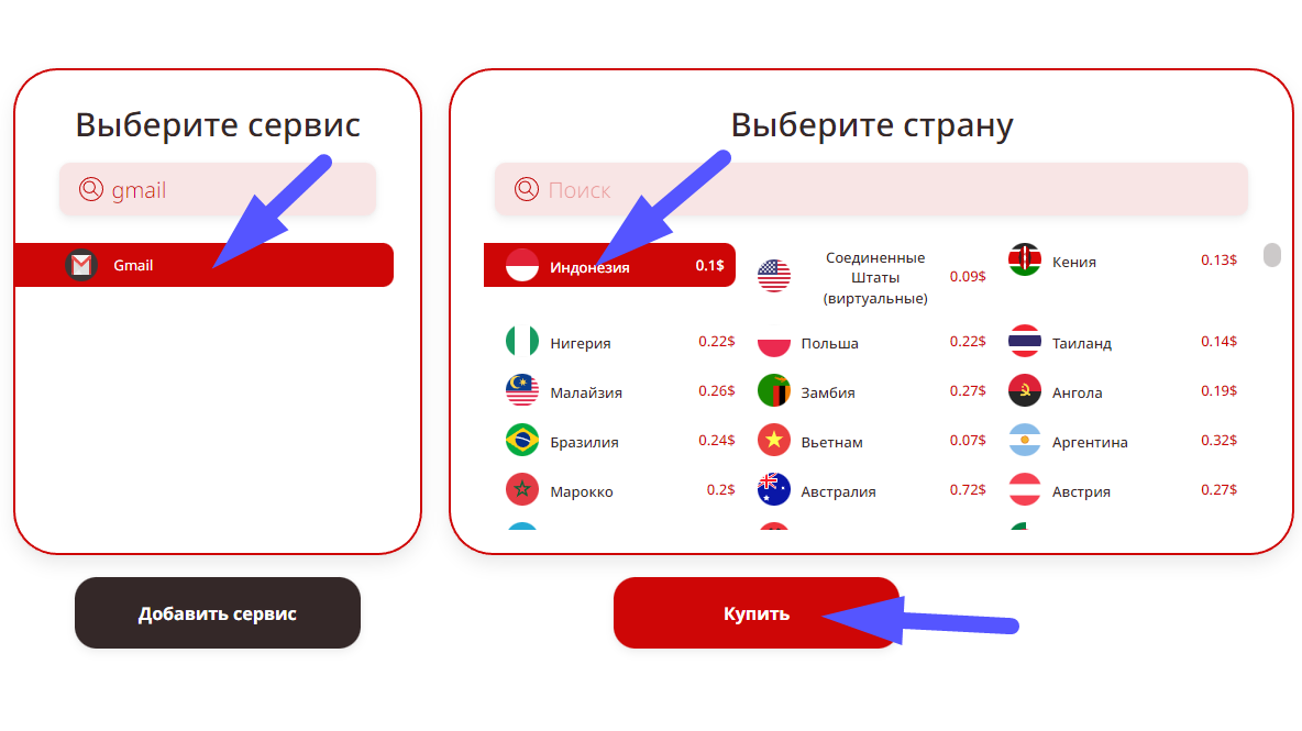 Теперь нам нужно купить номер Гугл (Google). Сначала, нужно указать сервис (выбираем Gmail), потом страну. Можно найти подходящий вариант непосредственно в списке или воспользоваться строкой поиска. Нажимаем «Купить» для перехода на следующую страницу.