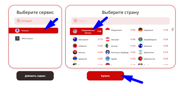 Необходимо купить виртуальный номер для Амазон. Сначала, указываем сервис, потом становится доступно указание страны и активируется кнопка «Купить». Чтобы не искать в обширном списке нужный вариант, можно воспользоваться поиском. Достаточно ввести интересующее название полностью или частично, чтобы система выдала все совпадения.