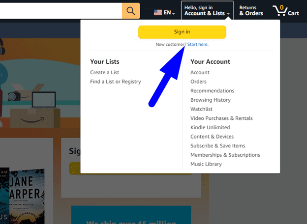 Заходим на официальный сайт торговой платформы. Необходимо учитывать, что русского языка нет, но можно использовать расширения или встроенные опции браузера. Нас интересует верхнее меню, а точнее, его правая часть. Сначала, нажимаем «Account & Lists», а потом «New customer? Start here».