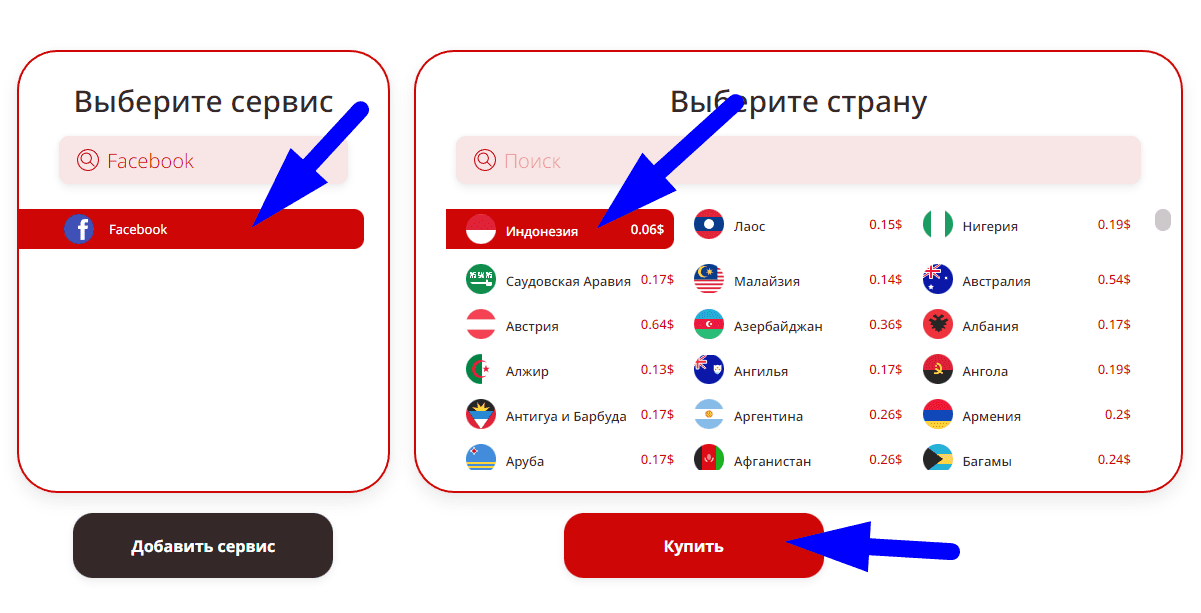 Теперь, имеется все необходимое для того, чтобы купить номер телефона для регистрации на *Фейсбук. Переходим в магазин, где сначала указываем интересующий сервис (*Facebook). Когда он выбран, в правой колонке появится список стран. Нажимаем на интересующую, появляется сумма за один номер. После этого, становится активной кнопка «Купить».